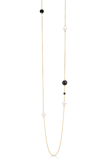 CARNIVAL halskæde i forgyldt sølv med hvid perle og onyx. Længde 80cm