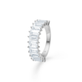 - Geometrisk design: Baguetteslebne sten danner et stringent, grafisk bånd på fingeren.