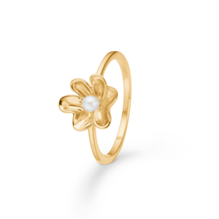 Pearlily ring i 14 karat guld med en rund hvid kulturperle centreret i et organisk blomsterdesign.