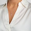 Designer Mads Ziegler lod de frie streger forme vedhængets åbne silhuet – en organisk og blødt rundet hjerteform, der hylder dansk designtradition. Pavéen af facetslebne zirkonia følger konturen i en ubrudt linje, så lyset elegant bevæger sig langs rammen. Den vinklede bøjle tilfører stabilitet og retter smykket på halsen, mens den polerede overflade spejler hudens glød. Et vedhæng med alsidighed, skabt til hverdagens skiftende udtryk.