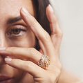 Bær Vianna ringen alene for et grafisk statement, eller kombiner med simple glatte guldringe for et mere personligt udtryk. Designets alsidighed gør den egnet både til kontorets skarpe stil og middagens mere uformelle samvær.