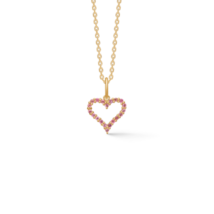 Tender Heart Pink vedhæng i 14 karat guld med pink turmalin, indfattet i grabbefatning og åben hjerteform. Måler 14 mm i bredden.