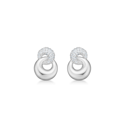Bær øreringene alene, hvor de tilfører sofistikeret udtryk til hverdagen, eller kombiner med enkle sølvhoops for et personligt look. Til arrangementer fremhæver opsat hår glansen i pavéfatningen og understreger designets elegante linjer.