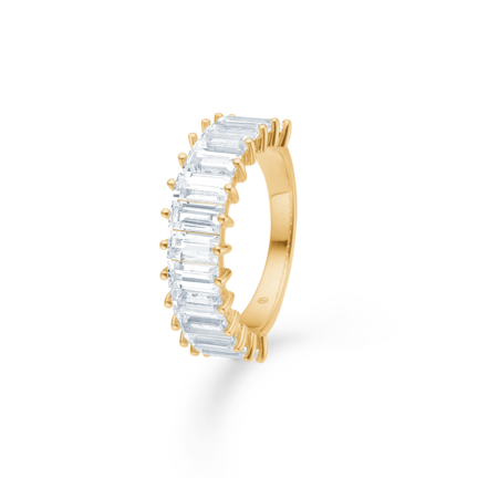 - Geometrisk design: Baguetteslebne sten danner et stringent, grafisk bånd på fingeren.