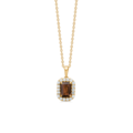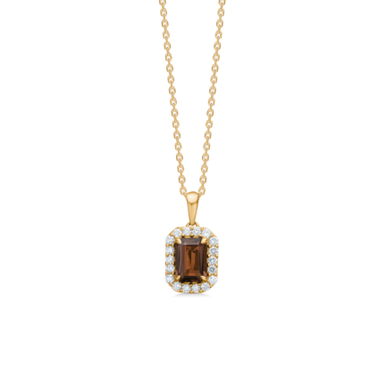Cognac vedhæng i 14 karat guld med emerald-slebet cognacfarvet røgkvarts og 0,22 ct. brillantslebne diamanter W.SI som halo, måler 11 mm.