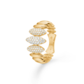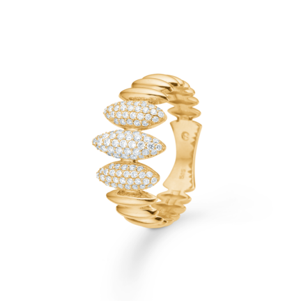 Designer Mads Ziegler lod sig inspirere af skulpturelle kurver og harmonisk balance, hvor bevægelser fra havets rolige bølger fortolkes i blødt svungne linjer. Den ribbede ringskinne følger elegant fingeren, mens tre forhøjede marquisepartier sætter fokus på pavéindfattede brillanter, der reflekterer lyset fra flere vinkler. Hvert element er skabt med omhyggelig opmærksomhed på detaljen og bidrager til et design, hvor organiske former og præcise linjer mødes. Gold Label-kollektionens ædle materialer og kompromisløse guldsmedekvalitet giver ringen varig værdi og et autentisk udtryk.