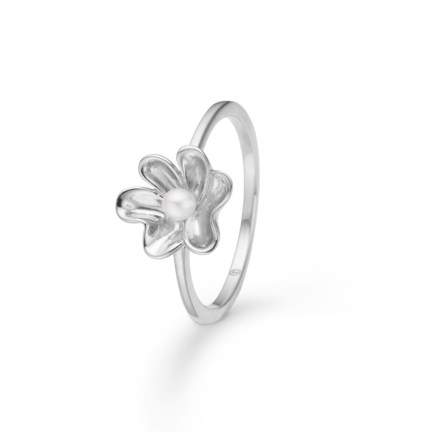 Pearlily ring i sterlingsølv med en håndindfattet, kugleformet kulturperle placeret i midten af et organisk, dansk design inspireret af liljens former.