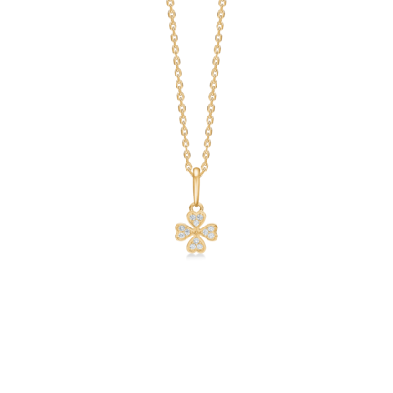 Petite Clover vedhæng i 8 karat guld med zirkonia, elegant formgivet til alle anledninger. Måler 7 mm.